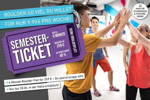 Jetzt clever sparen und bouldern so viel Du willst, für nur 9,90 € die Woche! Hol Dir das Sommer-Semesterticket und bouldere 6 Monate lang für nur 259 €!